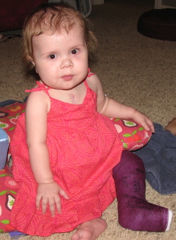 Went to the Orthopedic doctor today. She made me feel a little better. Said babies with small bones like Annabelle’s are VERY suseptable to this kind of break. I wish I would have known that going into it. This momma wouldn’t have even attempted to get her to stand at home! (and in the future, Mommy and PT will have a very tenuous at-home relationship!)